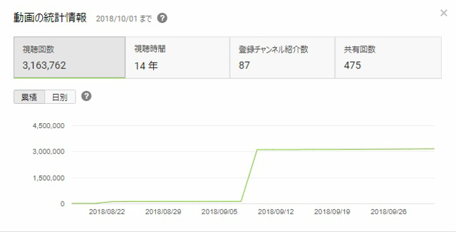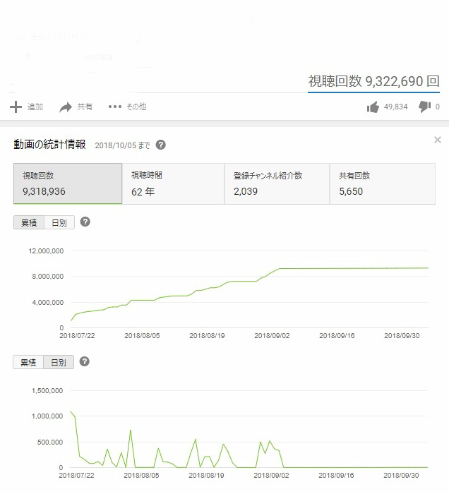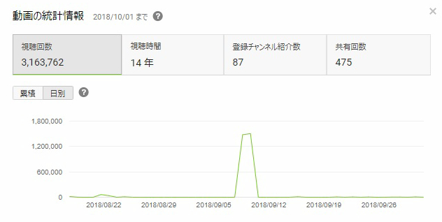 下は統計情報の視聴回数を上の累積から日別に変えたグラフです。やはり上と同じ頃の数日のみ視聴回数が増えてることがわかります。グラフでは数日で約300万ほど増えている様に見えます。断言は出来ませんがもしかしたらこのミュージックビデオの本当の視聴回数は約16万回でその他はお金で買ったフェイクビューなのかもしれません。